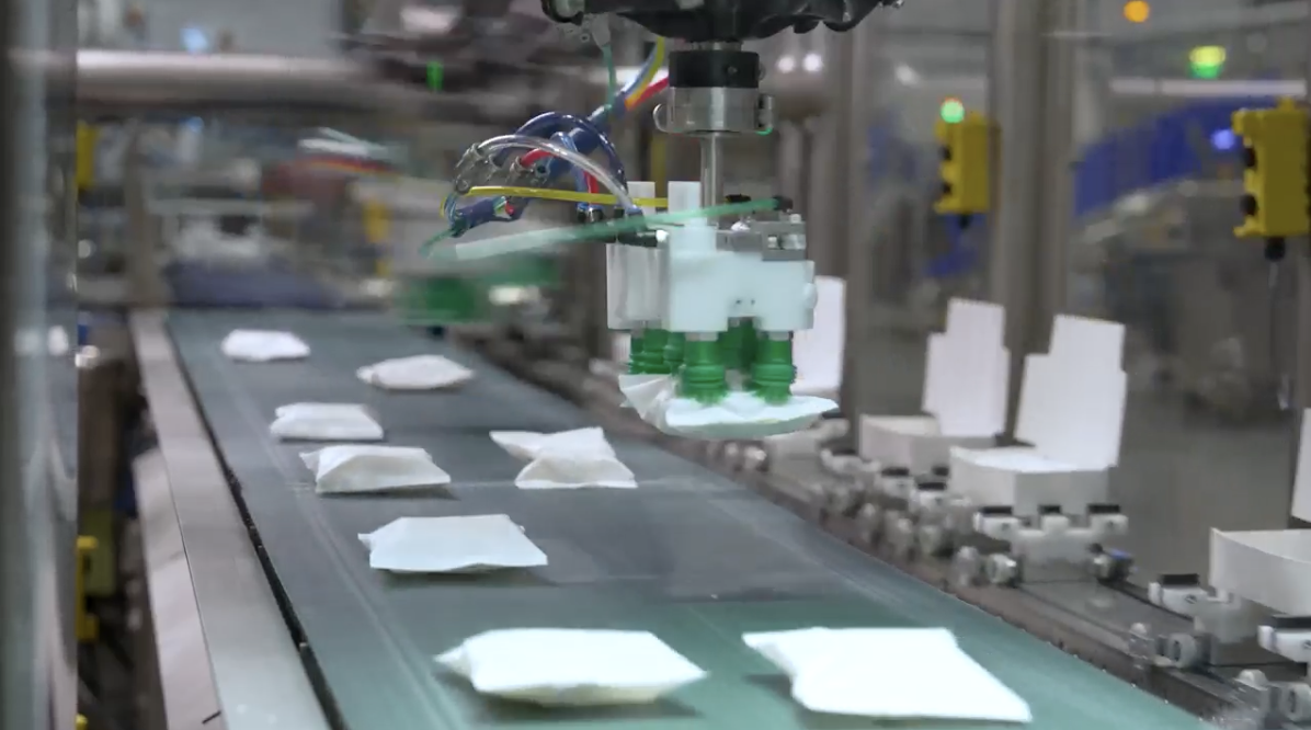 On the award-winning PEEPS line, 16 total vision-guided robots equipped with Soft Robotics grippers gently and accurately pick up marshmallow candies from conveyors and place them into paperboard or plastic trays.